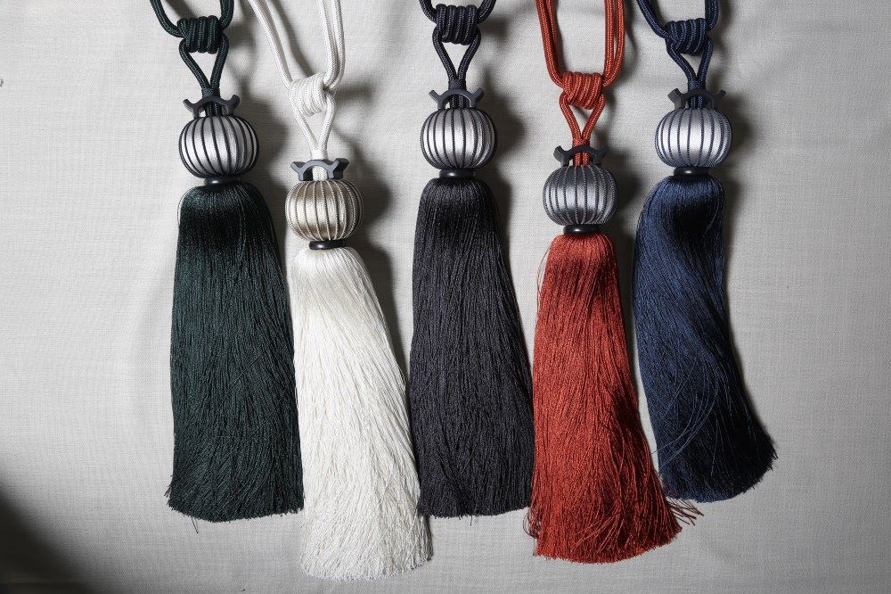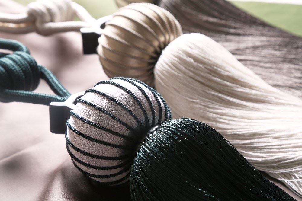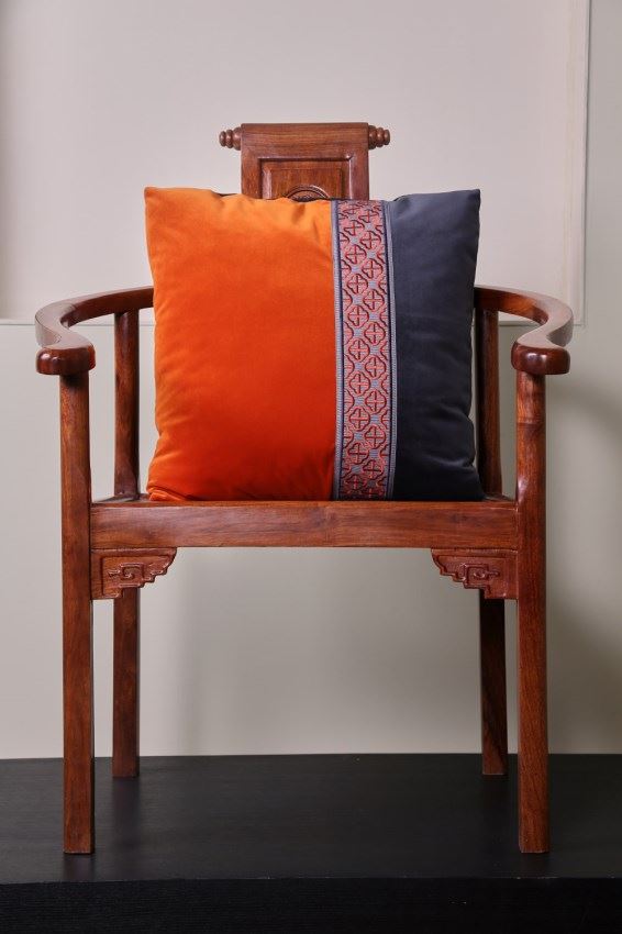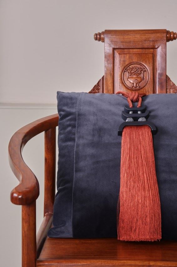 我們依據(jù)梅花窗的圖案,設計了兩款帶子,搭配窗簾和抱枕,把江南唯美的文化氛圍,通過與布藝的結合置入中式家居。