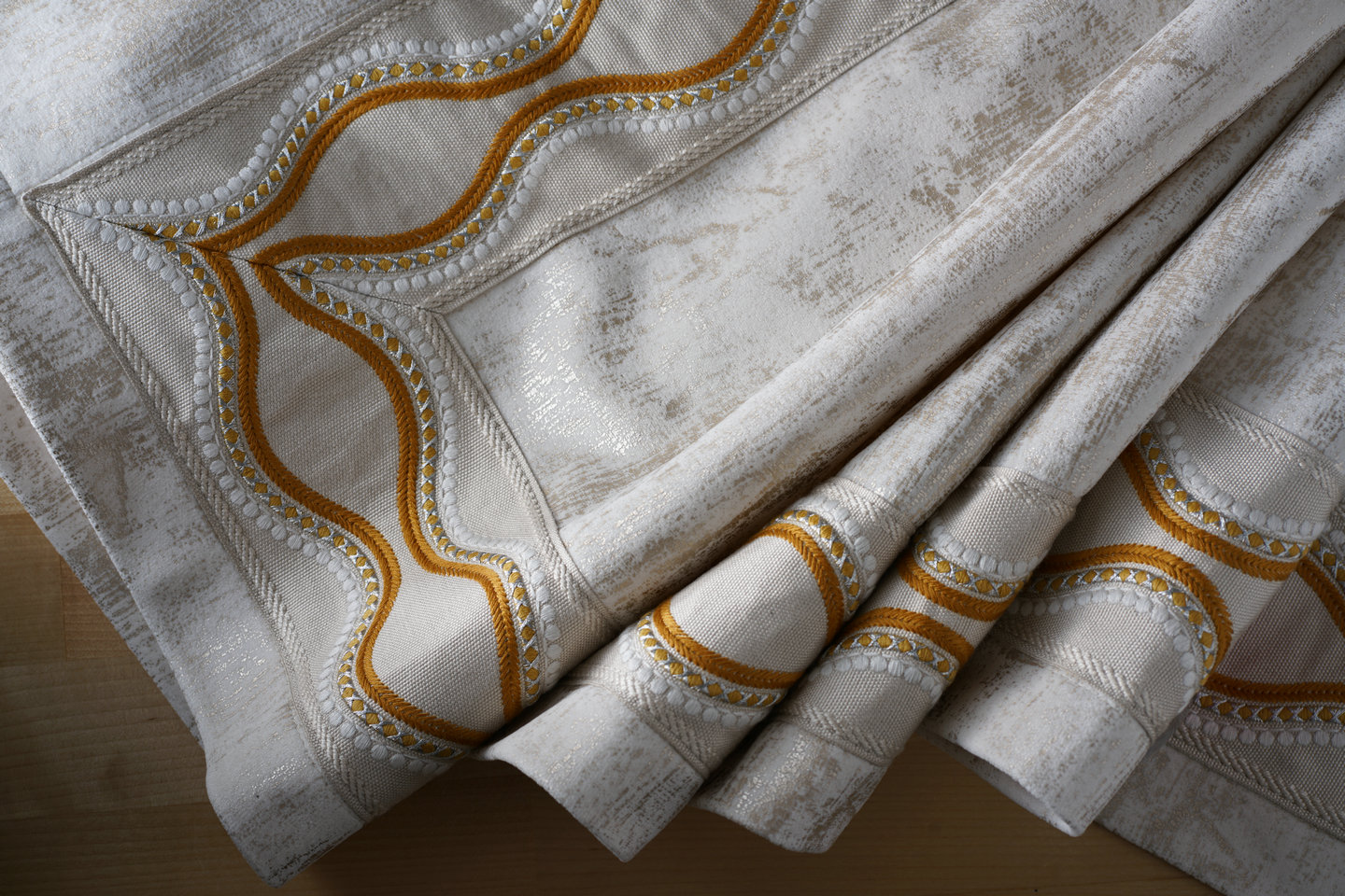 以人棉為主要原料,呈現(xiàn)啞光的、柔軟的感覺,再加上一點(diǎn)點(diǎn)的金線,仿佛在平靜的水面上,波光粼粼的動(dòng)感。