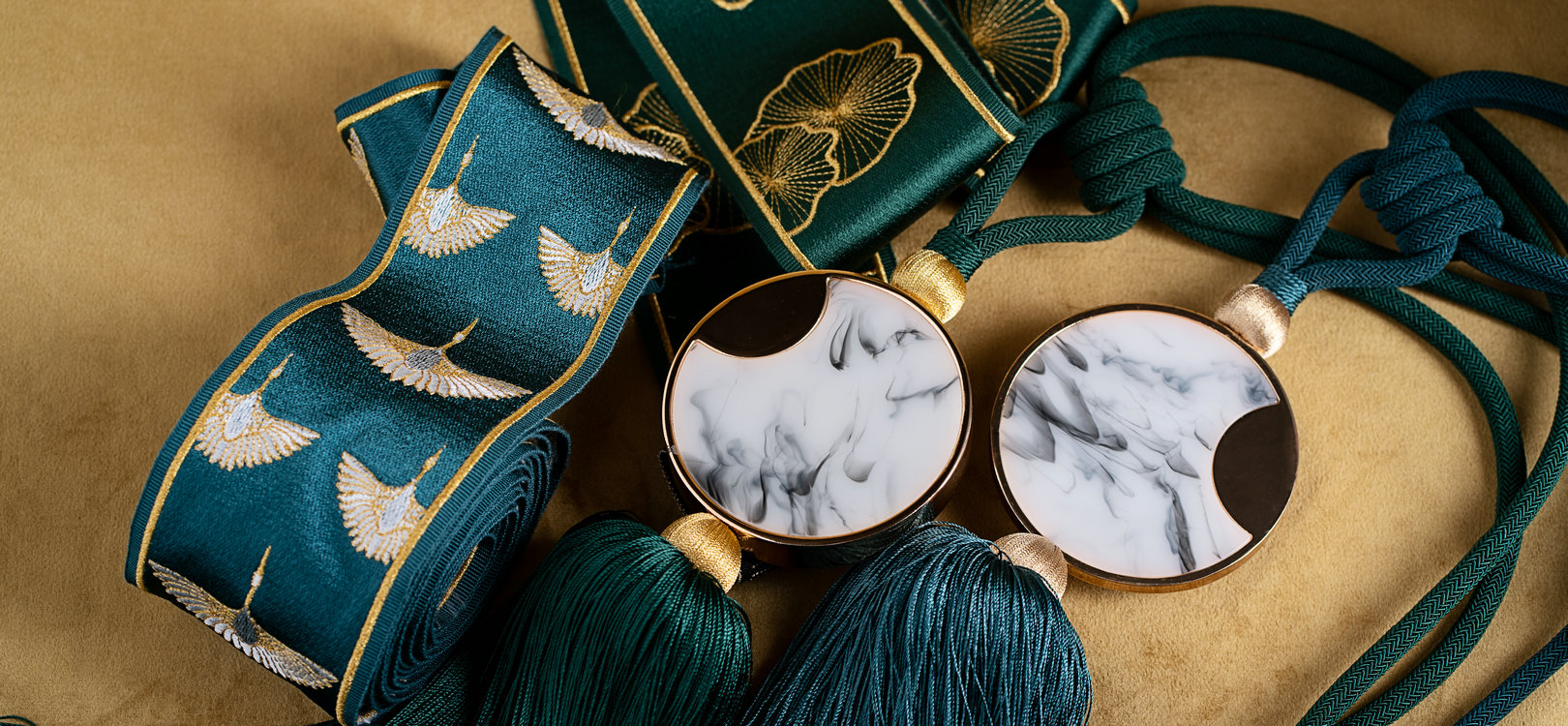 鎏金閣系列產品將傳統(tǒng)元素與摩登時尚的新設計相融合,以緞紋底帶呈現(xiàn)華貴光感,展示新中式的時尚與富麗堂皇。